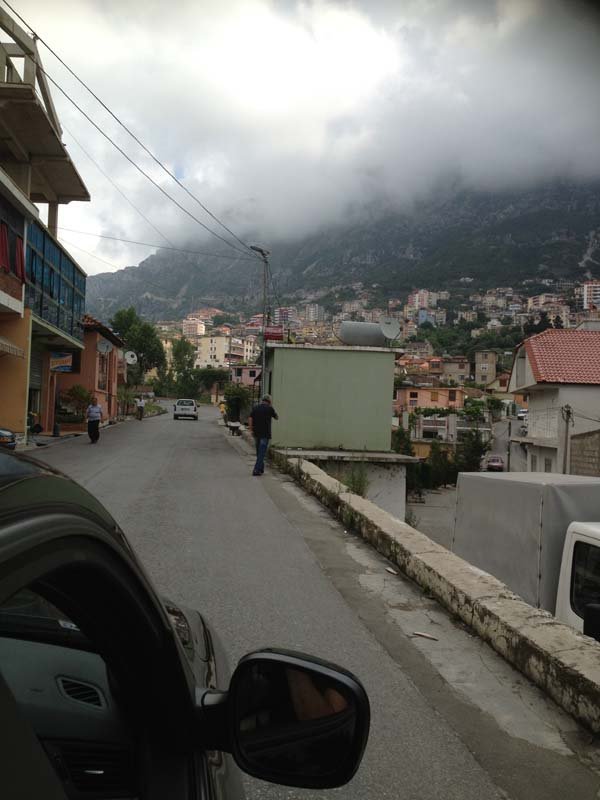 Bashkim met us for coffee in the Hotel Iliria café next door. His friend Nick was to take us out driving today. After a quick intro and coffee Nick drove us to the Dion Travel Tirana branch to meet Migena and Elidon at their modest office which was part of a row of shops. I took a quick moment to venture around the block.