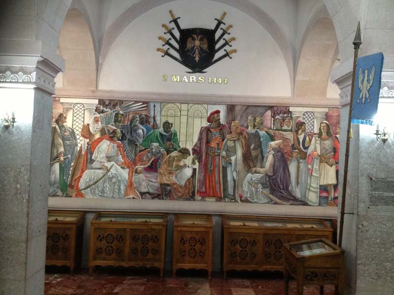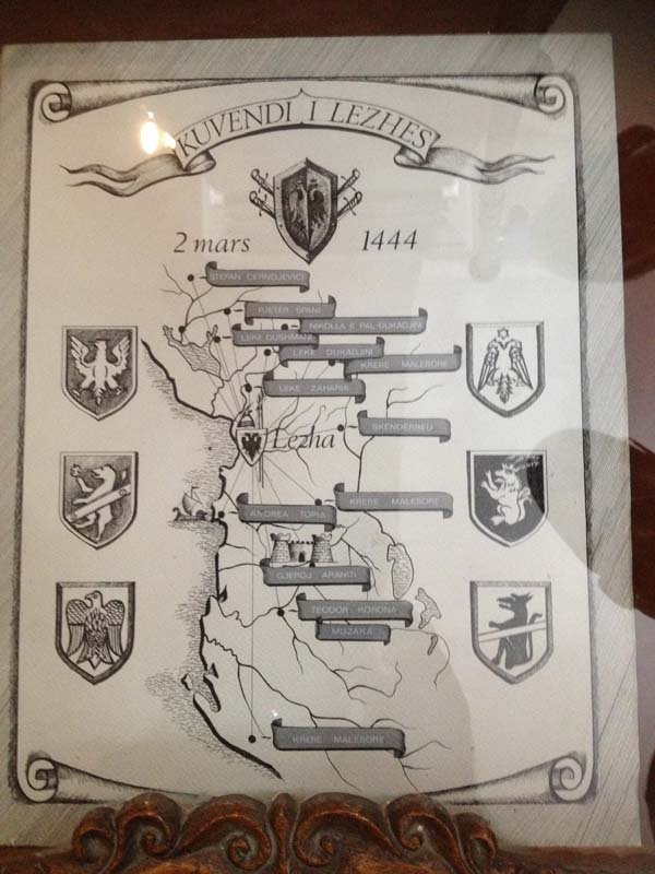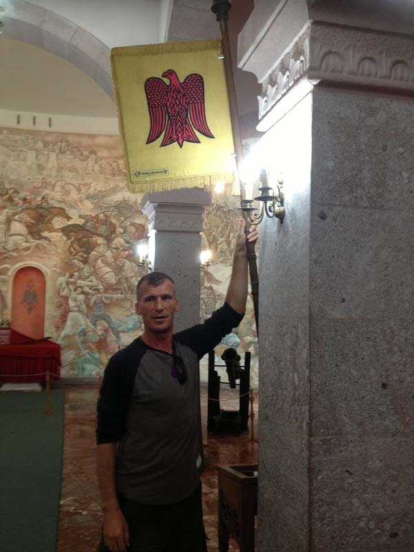 As is the case in most institutions, no photos were aloud in the museum itself. The artifacts – documents, armature, clothing, furniture etc were incredible. Though this didn’t stop Bashkim, and in turn Rohan and I as we took his lead. No problem was the catch cry of defiance in typical Musaka style! So I made sure I got a picture sitting in Skenderbeg‘s throne and next to the flag of the Musaka Coat of Arms. A map showed the region ruled by the Musaka clan.